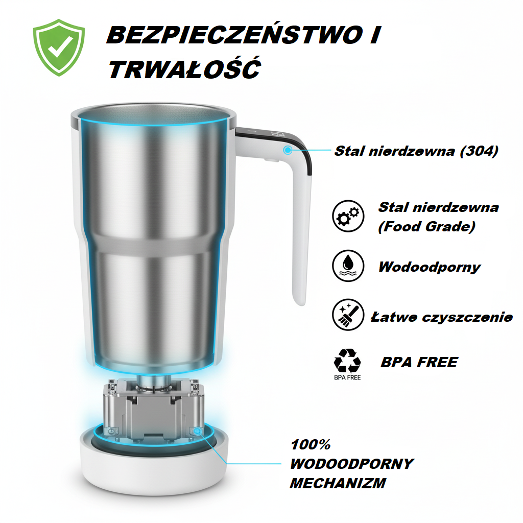 Nasz kubek z automatycznym mieszaniem podnosi jakość napojów, oszczędza czas i oferuje elegancję oraz nowoczesność, które wyróżniają go na tle konkurencji. Wybierz mądrze i odkryj smak idealnie wymieszanych napojów.